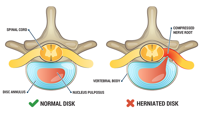 A herniated disc is a condition in which the nucleus pulposus (located within the center of the disc) herniates. This herniation causes pain and maybe even more pain if the herniated disc begins to press on the adjacent spinal nerves, causing pain and inflammation.